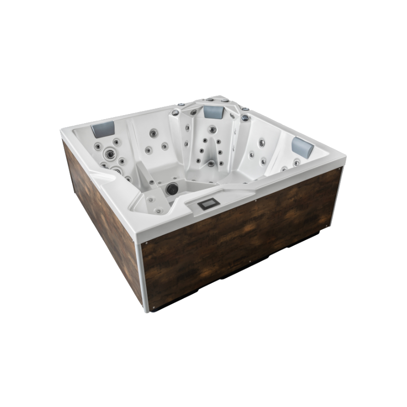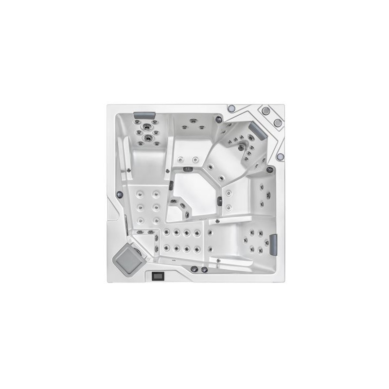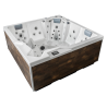 Le spa MYKONOS est un spa au design épuré composé de 5 places. Il est composé de 2 banquettes destinées aux personnes mesurant entre 1,40 et 1,70 M et de 3 places assises dont 2 assises droites + 1 basse, de manière à s’ajuster aux différentes morphologies. Il s’agit d’un spa carré qui mesure 200 x 200 cm avec une profondeur de 93 cm. Ce spa aux dimensions compactes s’intègre parfaitement dans les espaces restreints, les cours, les patios et terrasses.